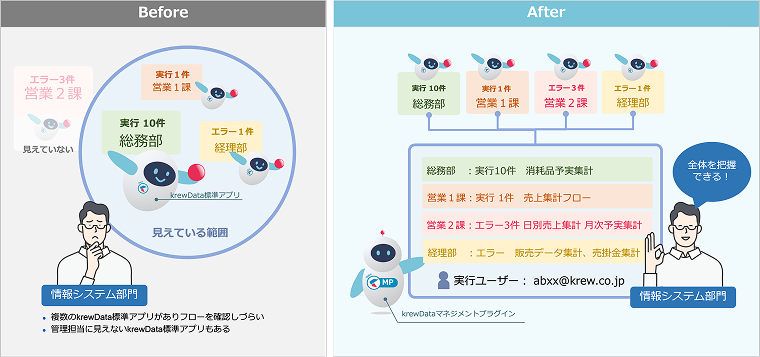krewData標準アプリを管理する機能をプラグインとして提供します。複数のkrewData標準アプリの情報を一元で管理できることにより、管理コストの削減とガバナンス強化にお役立ていただけます。