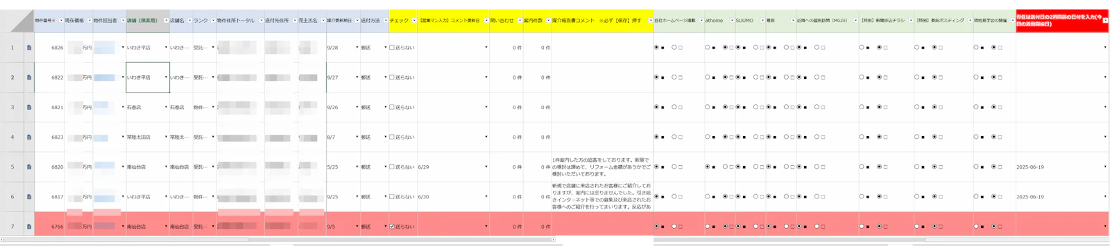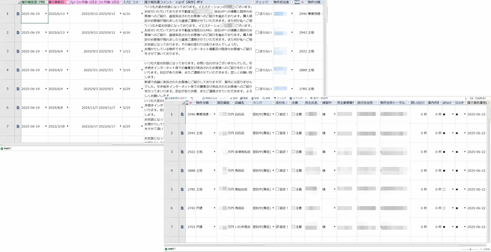 例えば、不動産会社は売主に定期的に問い合わせ状況を報告する義務があり、アドレスではこれを媒介報告書という書類で行っているが、この報告書作成のための情報をkrewSheetで管理しているという。報告書は2週間に1回メールもしくは郵送で売り主に送るもので、営業担当は販売活動の内容をkrewSheet上で記入し、事務担当者は、報告書を作成した日付や送付日などを管理している。作成された媒介報告書のデータは帳票出力プラグインを使ってメール用・郵送用の帳票を生成し、売り主に送付しているとのこと。kintone と krewSheetを導入する前は、販売管理システムで1件ずつ情報を入力・更新していたため抜け・漏れも多く作成に時間がかかっていたそうだが、入力に不慣れな営業担当者でもミスせずに情報更新できるようになったと好評だ。