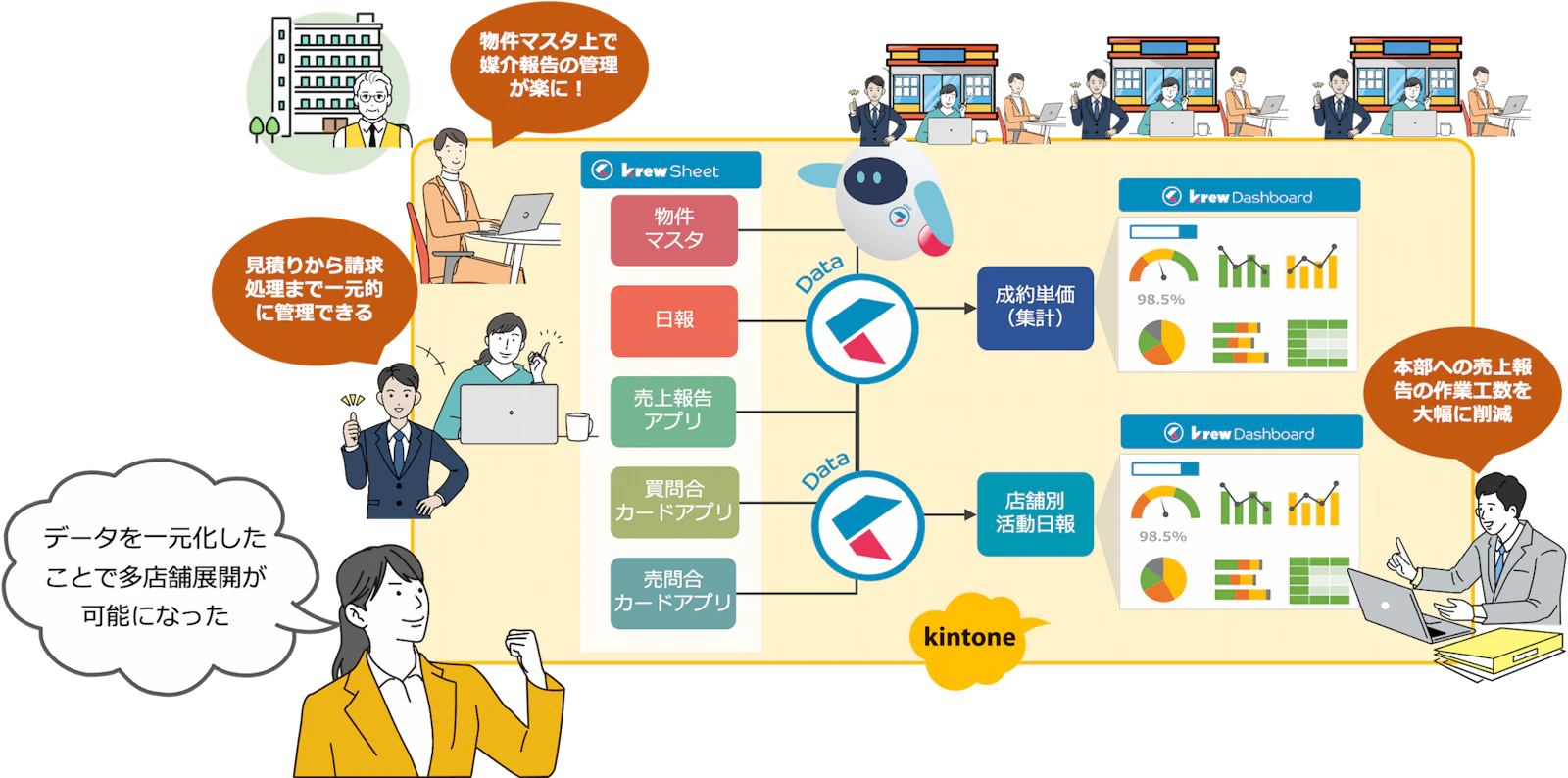 情報メンテナンスやアプリ間集計、営業マネジメントにkrewシリーズを随所に活用
