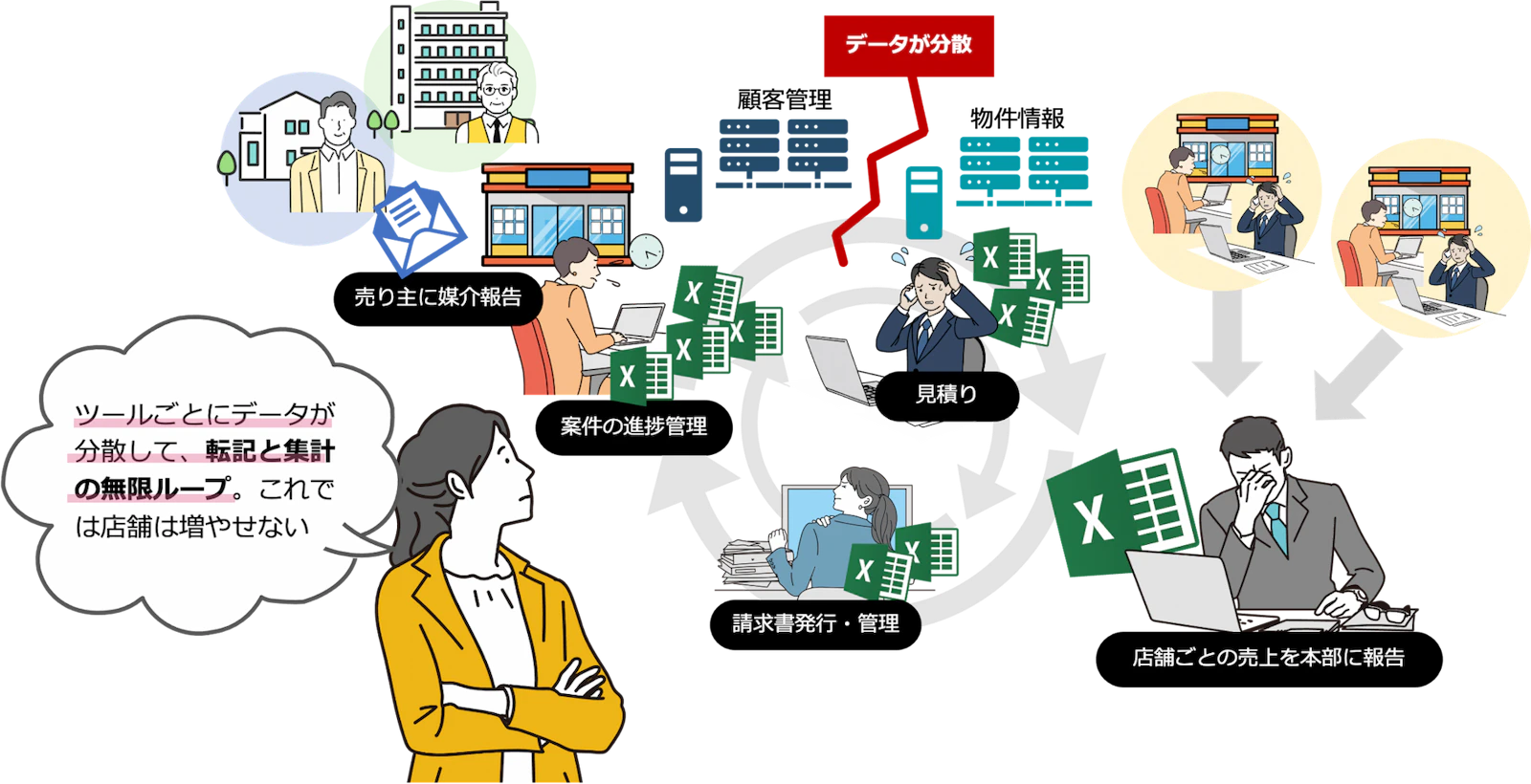 そんな同社では顧客管理や案件進捗などの業務に応じてさまざまなツールを駆使してきたが、情報を管理するツールが異なることで、物件情報や案件情報、見積、原価が途切れていて一貫しなかった。データを集計するにも転記が多く、抜け漏れや伝達し忘れなど情報管理の面で課題が顕在化していた。