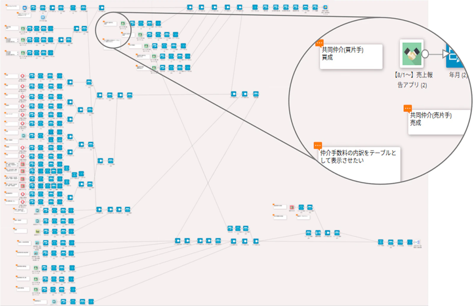 krewDataについては、店舗ごとの売上や利益、担当した営業の人数といった報告書を本部に提出するためのデータ集約で活用している。日報や売問合アプリ、物件マスタ、売上報告など各アプリに記録されている販売情報をスケジュール実行で毎晩集計しているそうだ。データ編集フローは複雑だが、krewDataのコメント機能でメモを残すことで属人化しないように工夫しているとのこと。