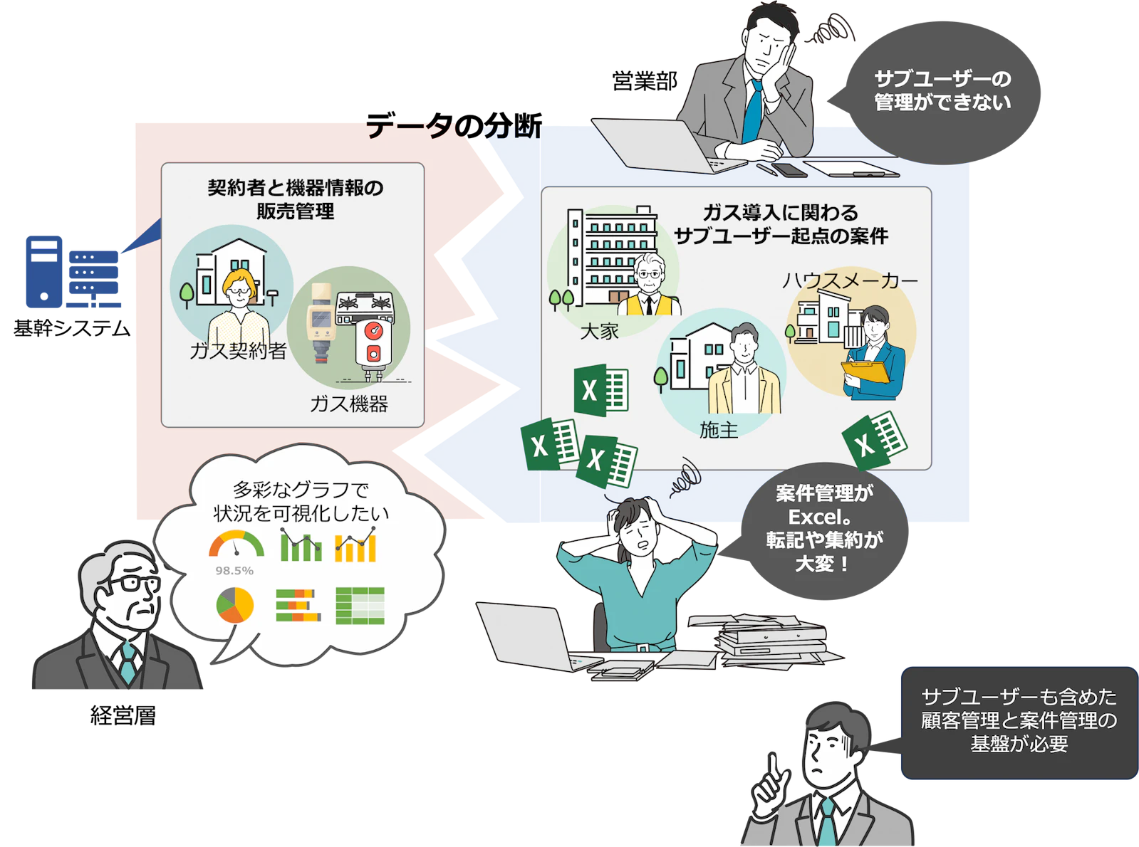 なかでも、営業部門ではハウスメーカーや施主(いわゆる「サブユーザー」)といった、直接の契約者ではないもののガス導入の意思決定に関わる重要なステークホルダーの情報が十分に管理されておらず、商談履歴も含めて紙やExcelを中心とした属人的な管理にとどまっていた。