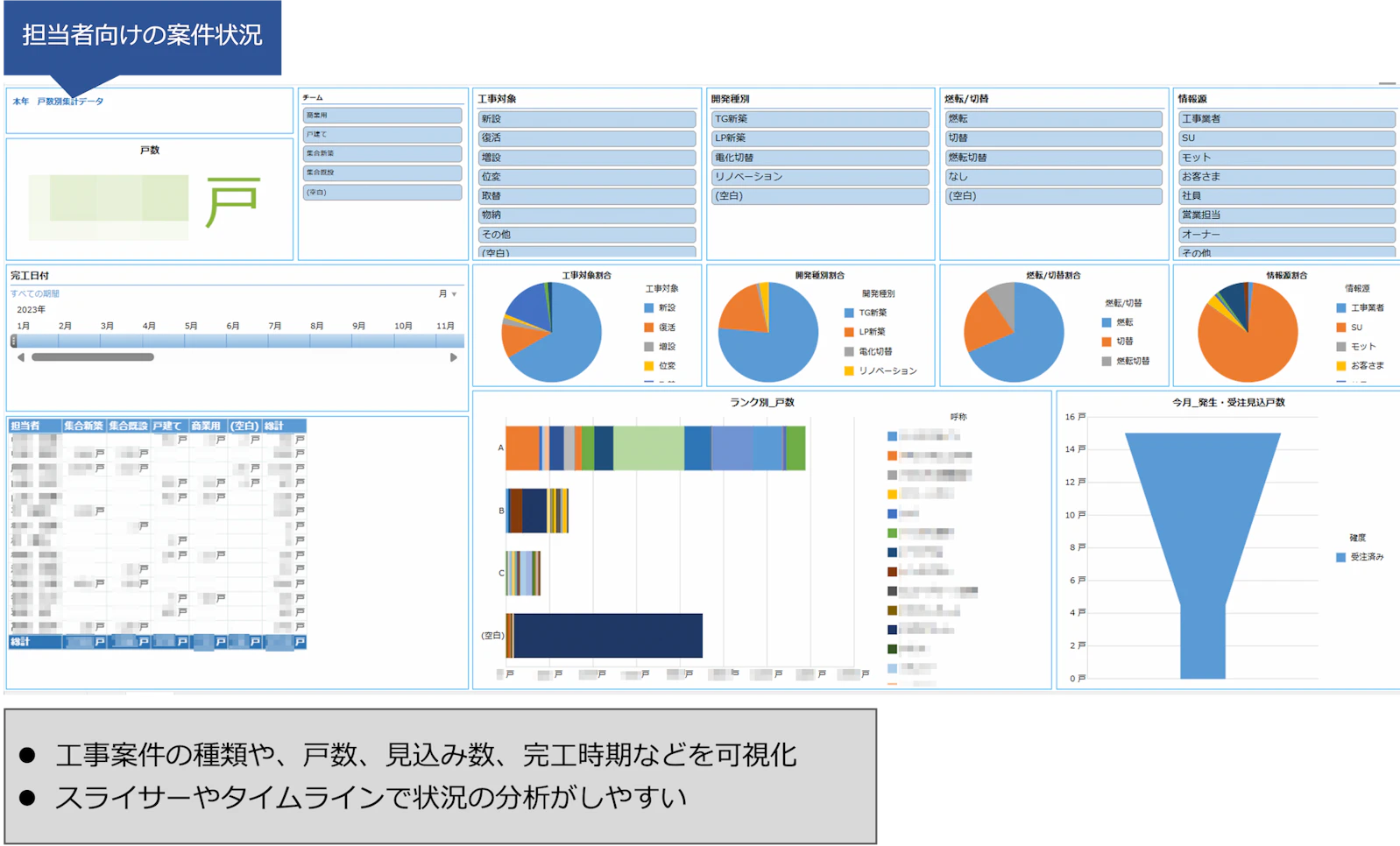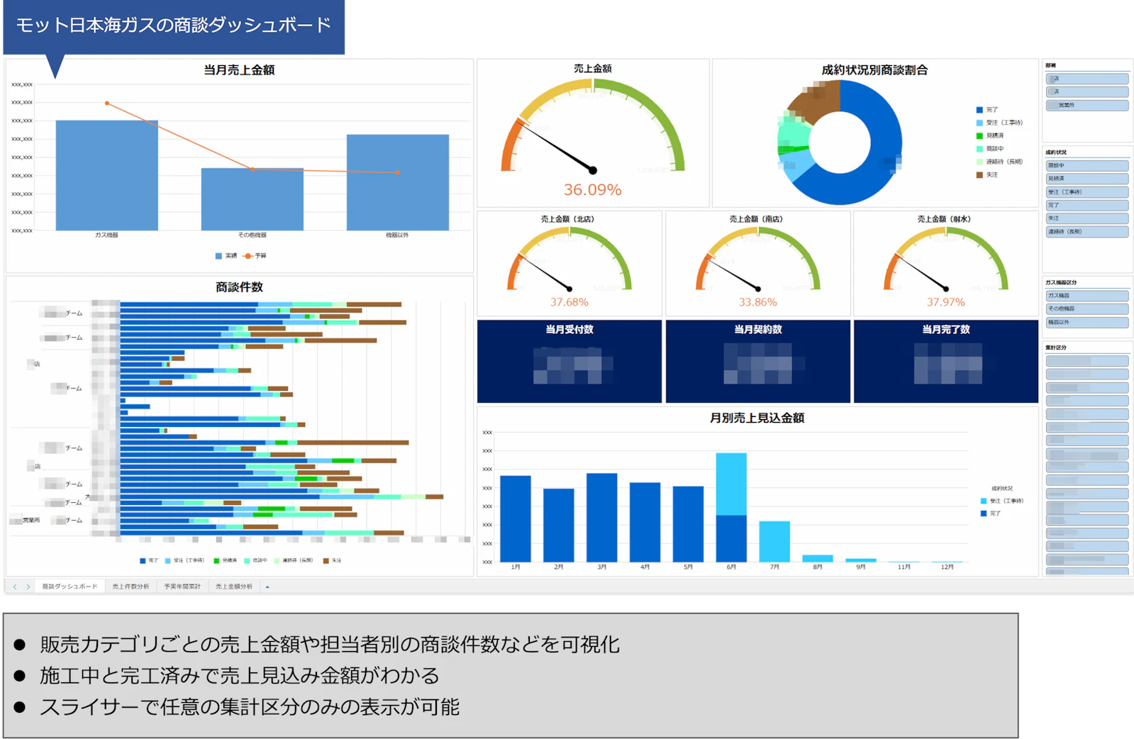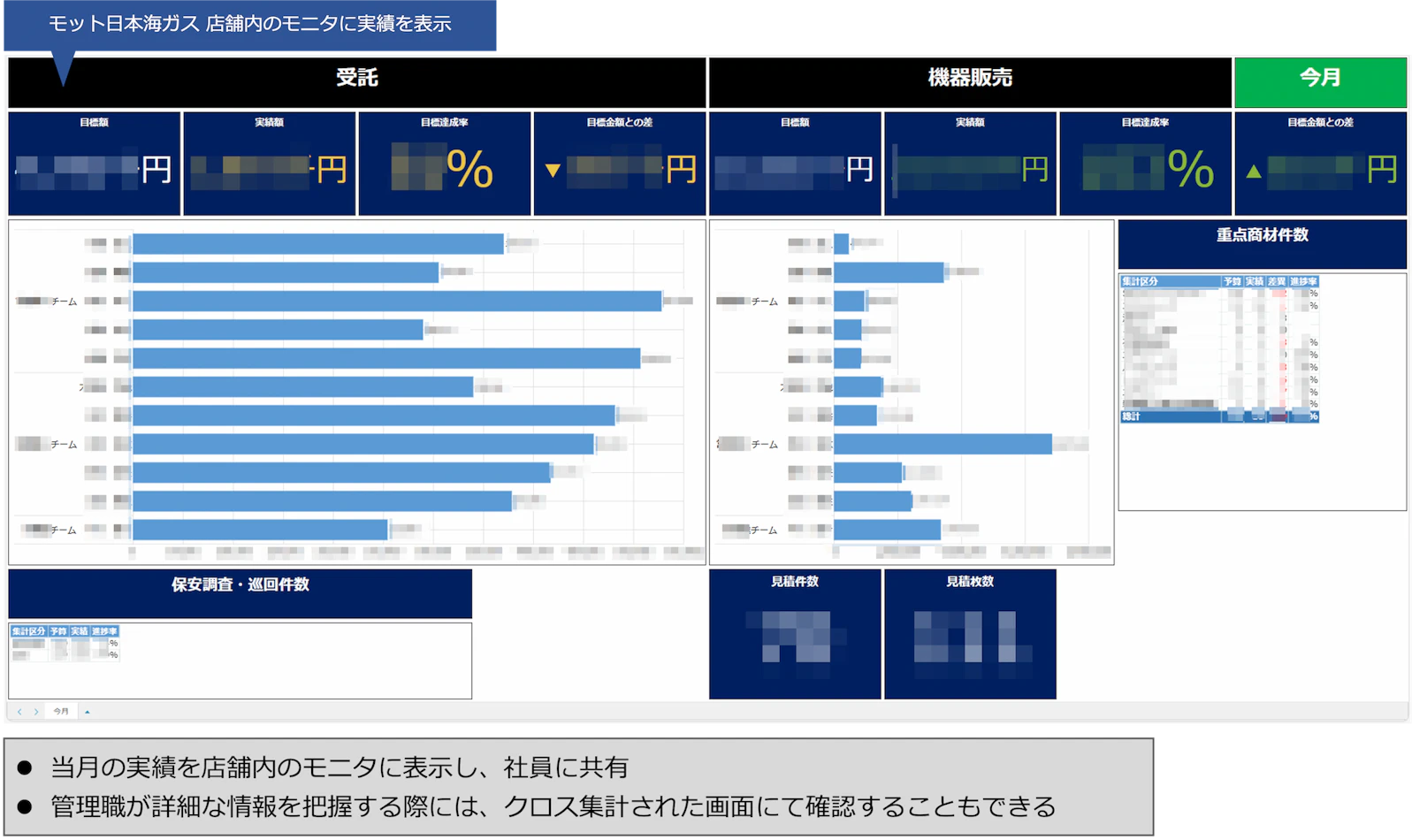他にも、日本海ガスの営業部門が利用しているサブユーザー向けのSFAアプリの情報を可視化するダッシュボードもkrewDashboardにて用意。「1つの画面で訪問件数をはじめとした商談情報が可視化できるように作成しています。また、別途担当者別やチームごとに確認したい情報をクリック1つで出せるようにしています」と佐々木氏。