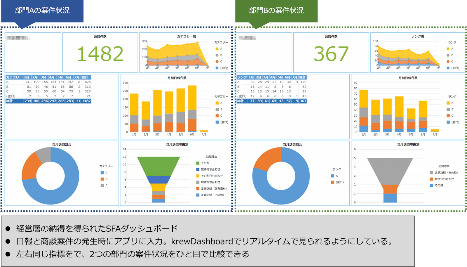 特に上層部のkintoneに対する懸念を払拭したのが、顧客や販売するものが異なる2つのグループを同一画面に並べ、同じレベルで比較できるようにしたダッシュボードだ。