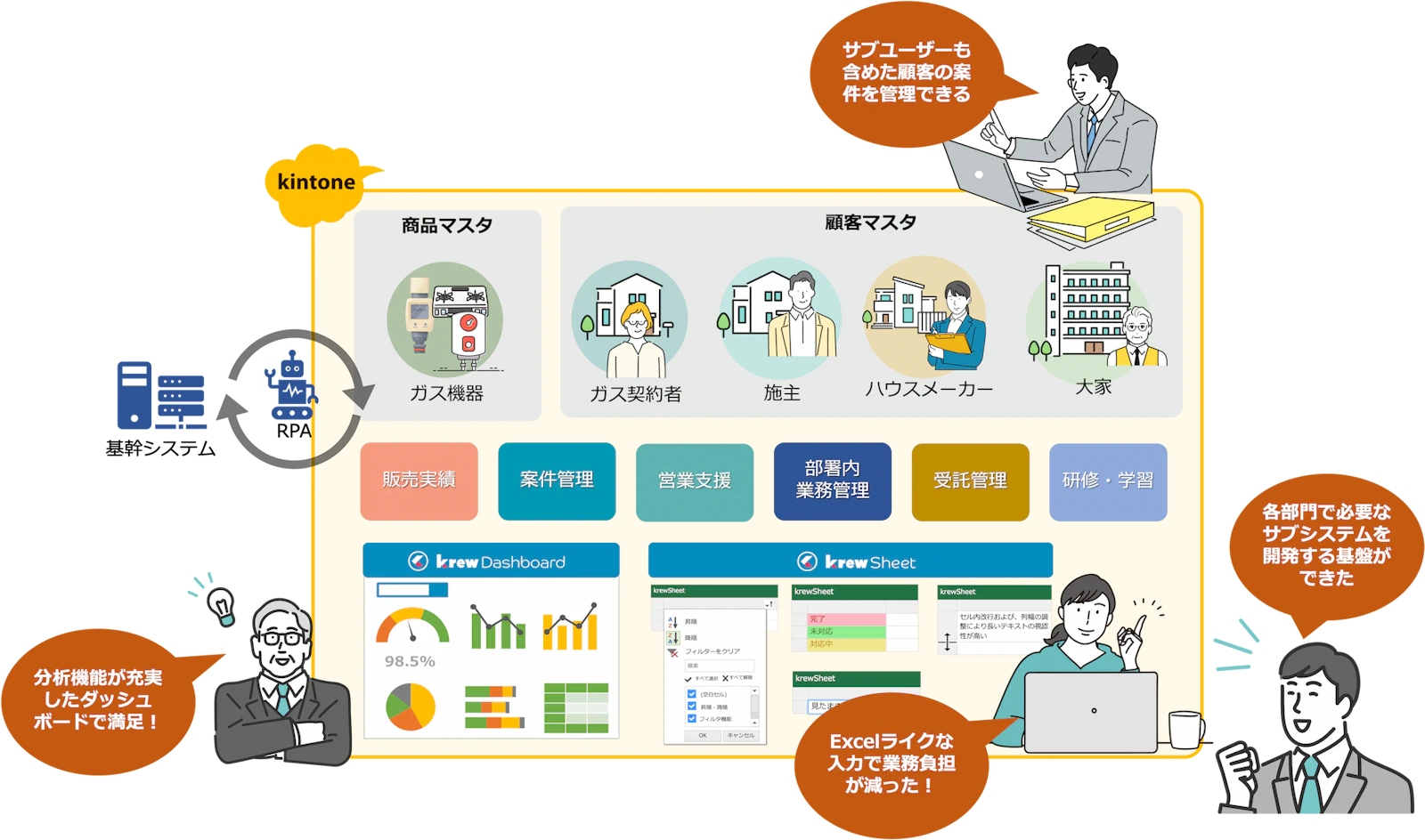 kintone導入により、基幹システムから顧客情報やガス機器の情報をCSVで取得後、RPAでkintoneに取り込んで業務管理に必要なアプリに利用するサブシステムをノーコードで開発できるようになり、顧客管理や商談情報管理などのアプリ開発を進めたものの、経営層に対して解決しなければならない課題があったという。