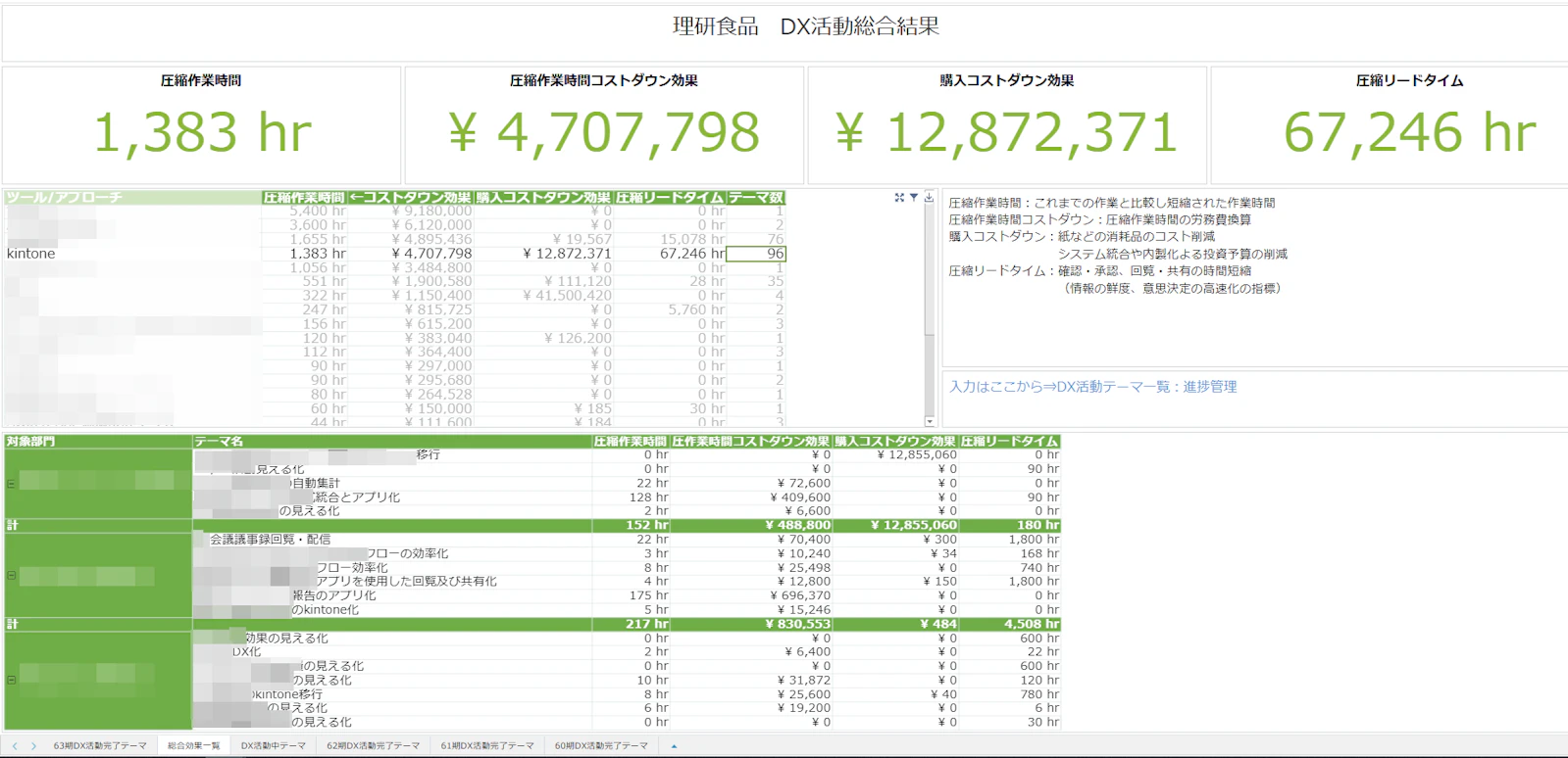 生産性をテーマにDXを推進している同社だけに、RPAやロボットなどさまざまなソリューションを駆使して作業の圧縮によるコストダウン効果を詳細に指標化しているが、その1つにkintoneとkrewシリーズを軸にした取り組みがあり、およそ1,400時間の作業時間の圧縮で500万円弱のコストダウン効果が得られているという。