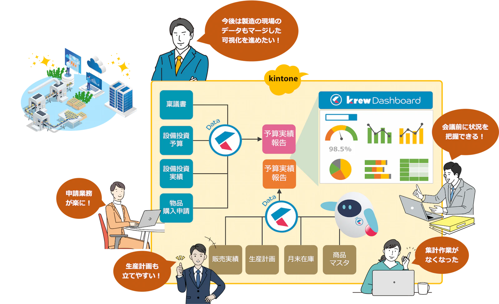 製造現場のさまざまなデータをkintoneで取り込みながら、krewDataでの集計およびkrewDashboardでの可視化を進め、現場へのフィードバックを目指すという。
