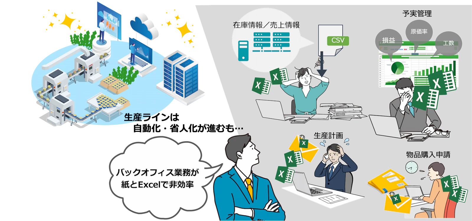 同社では、工場全体の省人化や自動化を進めながら、バックオフィス業務のDX推進を含めたスマートファクトリーを目指している。製造現場についてはIoT、RPAなどさまざまなソリューションを駆使して電子化やデータ収集を図っている状況にあるが、バックオフィス業務については紙やExcelが中心だったため、クラウドサービスとして内製化が可能で、かつワークフローが実装できる新しい環境を模索することになった。