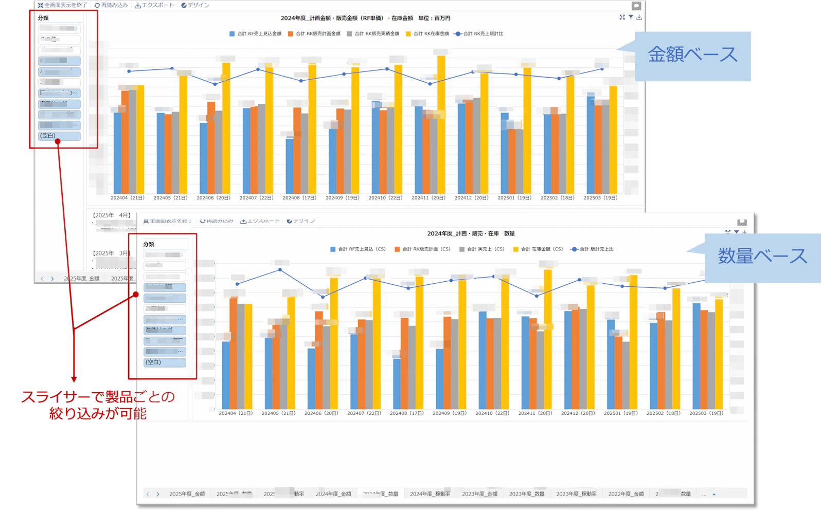 ▲計画、販売、在庫の推移データのダッシュボード、金額と数量がそれぞれ把握できる