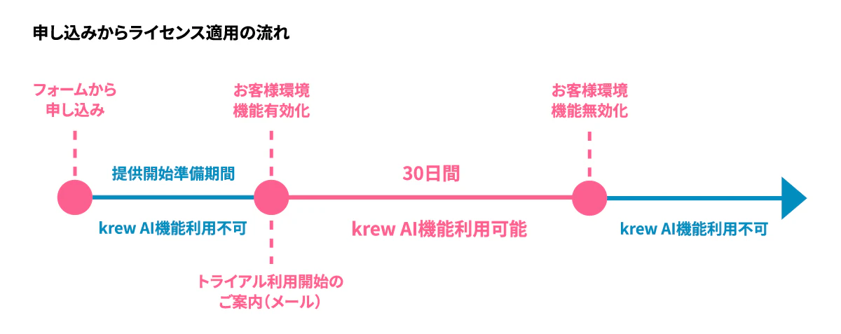 - krew AIラボで公開する各機能はご契約中の方がお試しいただけます。同一サブドメインで何度でもお申し込みが可能です。