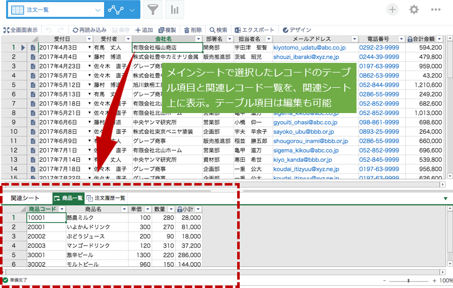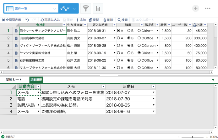 kintoneアプリのフォームでテーブルとして設定した項目および、関連レコード一覧を、krewSheetの「関連シート」で表示ができます。「関連シート」はkrewSheetの下部に表示できるサブシートです。関連シートでは、関連レコード一覧の項目の参照とテーブルとして設定した項目のレコードの登録・追加・編集・削除が可能です。