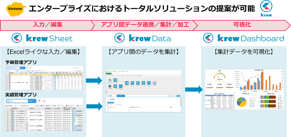 一方、「krewDashboard」は複数のkintoneアプリのデータをグラフ化しダッシュボードを作成します。krewDashboard単体で利用することもできますし、「krewData」と併用すれば複数のアプリを集計したデータをさまざまな視点でグラフ化しダッシュボードにできます。さらに、昨年12月に発売した「krewSheet(クルーシート)」と組み合わせることで入力からデータ可視化までkintoneの手軽さを生かしたエンタープライズレベルのシステムを実現します。