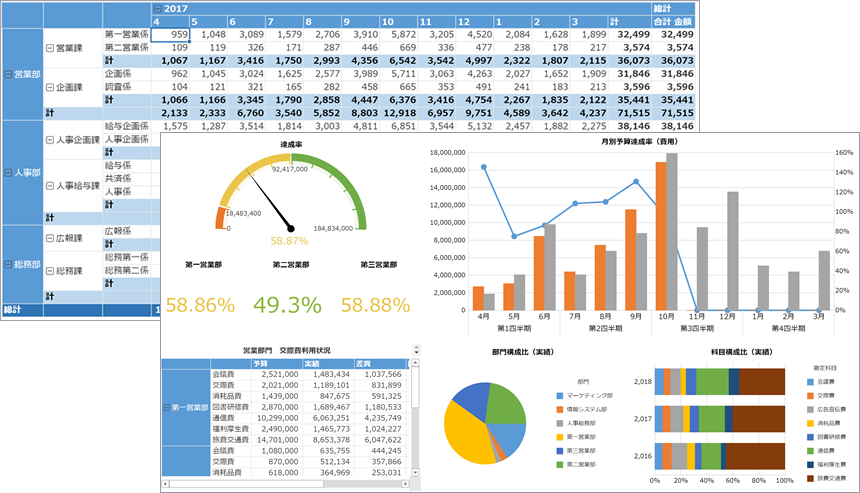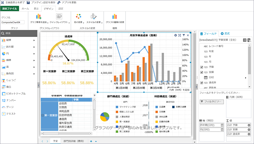対応グラフ種は棒グラフ、円グラフ、複合グラフ、じょうご(ファンネル)など多彩なグラフが利用できます。さらに強力なピボットテーブルにより階層ごとの小計行や列集計、総計の表示が可能。ソート、フィルタ機能、条件付き書式も備えます。ピボットテーブルはグラフとともにダッシュボード上に配置できます。