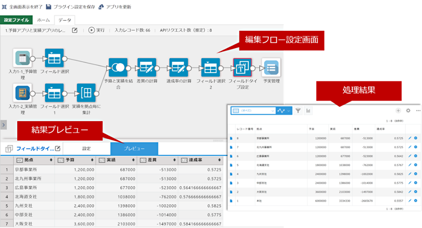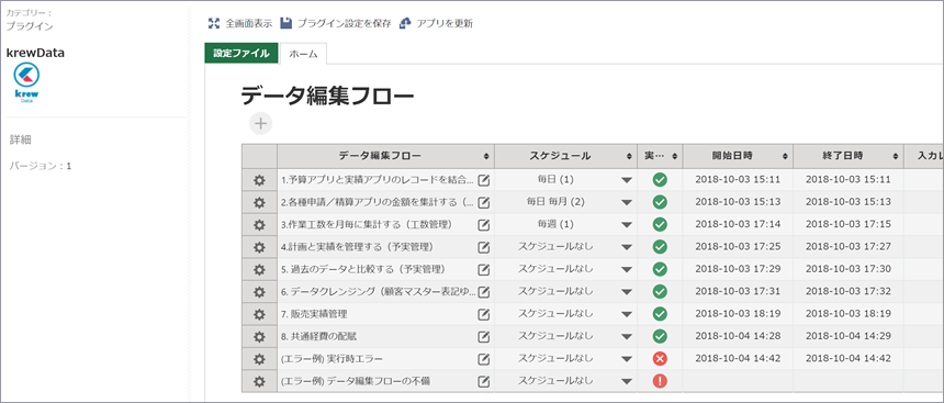 データ編集フローを実行した結果を一覧上で管理できます。結果の確認がとても容易です。