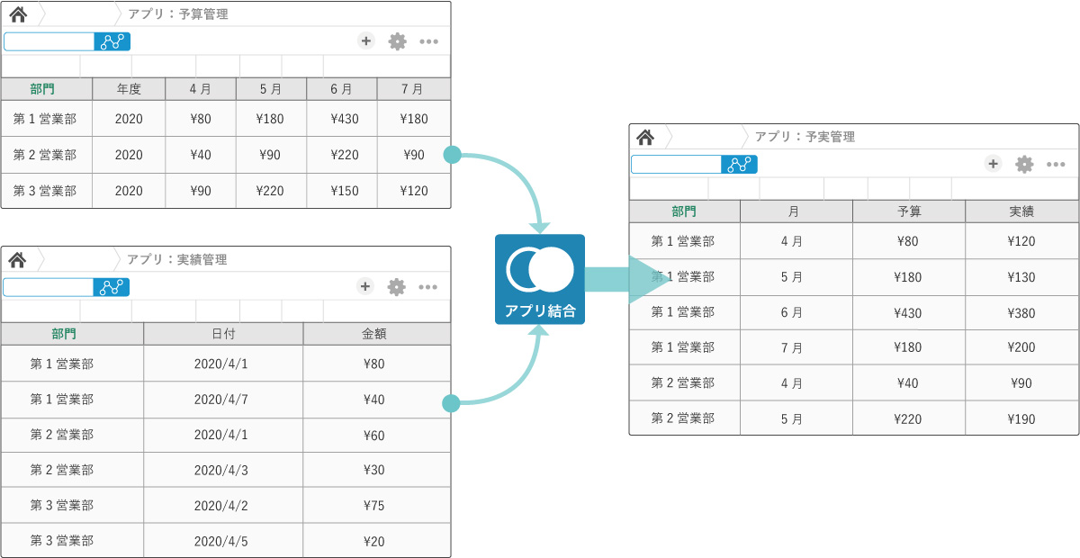 kintoneで作成したアプリから任意の項目を抽出して結合したり、差分の計算をしたりできます。実行前に処理結果をプレビューする機能も充実しています。