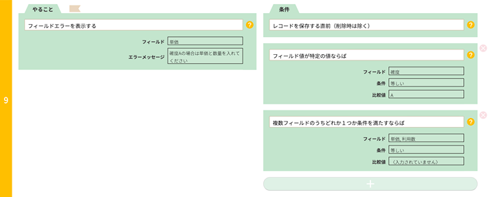- krewSheet専用の条件は「krewSheetを表示したとき」のみ。それ以外に追加された条件は既存の「レコードを保存・削除する直前」などに透過的に対応しているため、krewSheetの利用を意識する必要はありません。