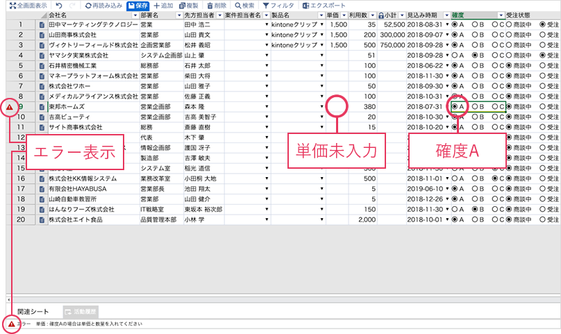 案件確度が「A」のときに単価と数量が入っていない場合にエラーを表示
