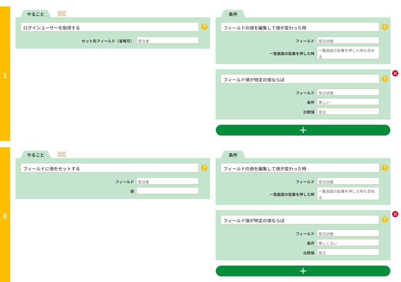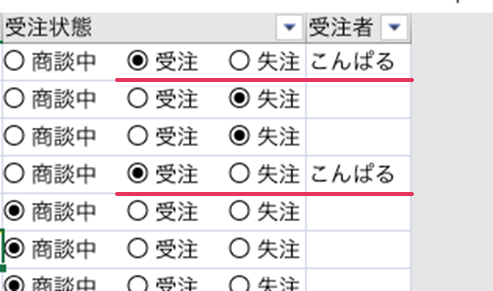 「受注状態」が「受注」になると「受注者」にログインユーザーの名前を自動セット