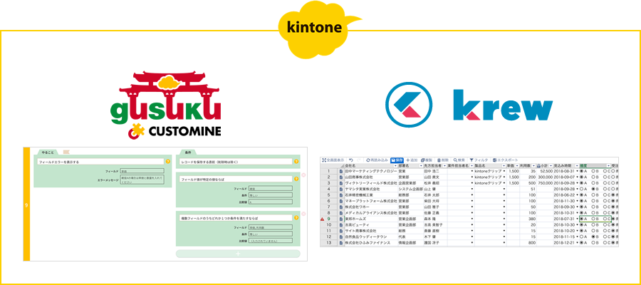 このたびの連携は「gusuku Customine」のアップデートにより「krewSheet」が提供するイベントAPIに対応したもので、krewSheet上でkintoneのデータを保存したり、編集したり、削除したりするタイミングを利用してフィールドの値を変更するなどの動的な処理がノーコードで実現できるようになりました。