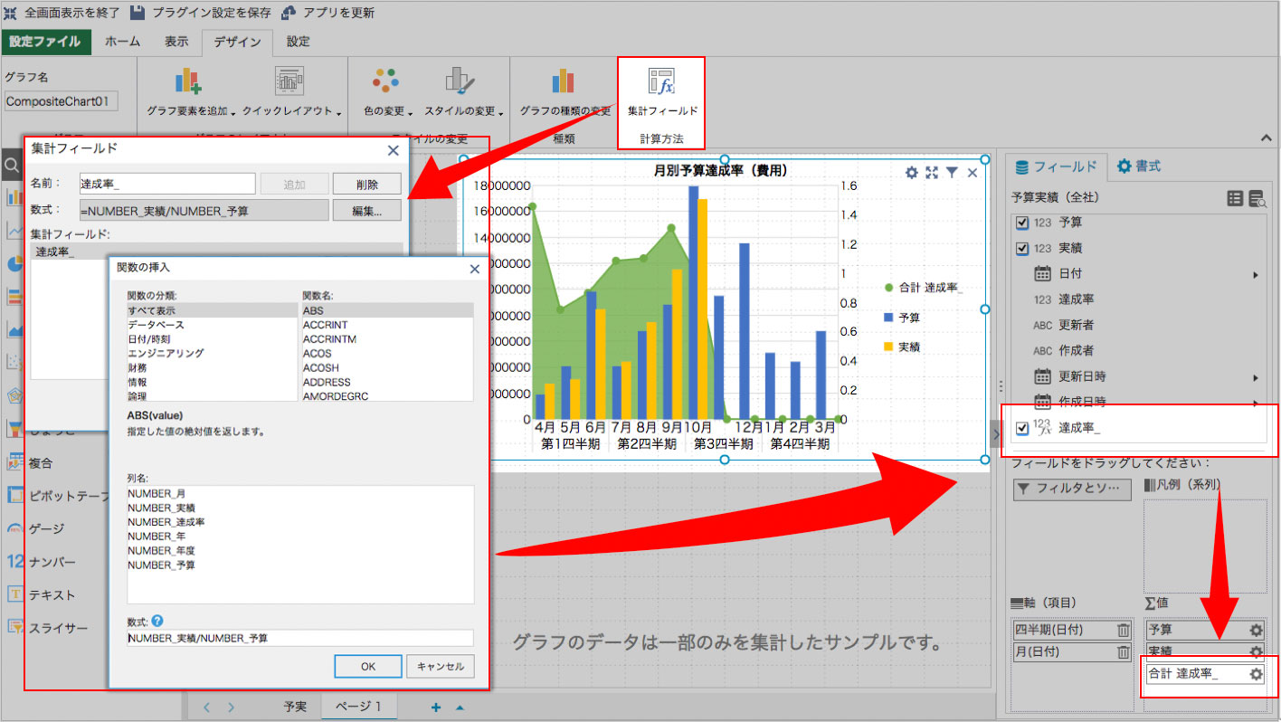 集計フィールドはグラフの元データとなるアプリに存在する項目から数式を利用して新しい項目を作成できる機能です。たとえば実績と予算から達成率を算出するといった使い方ができます。また、数式は関数を利用することが可能です。