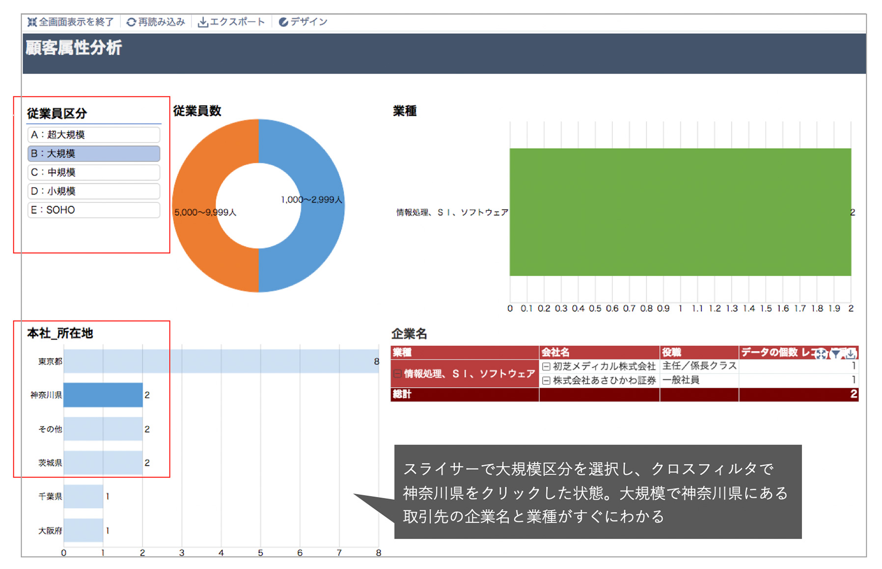 クリックするだけで、グラフやピボットテーブルに表示するデータを一括して絞り込める「スライサー」を提供します。スライサーは1つのダッシュボード上にある同じアプリのデータから作成したグラフに共通しています。たとえば、取引先情報アプリから複数の切り口のグラフをダッシュボード上に配置し、従業員数区分をスライサーとして利用した場合、従業員規模ごとの所在地や業種の偏りなどを瞬時に把握することができます。アプリのどの項目をスライサーとして利用するかは、krewDashboardの設定画面から行えます。