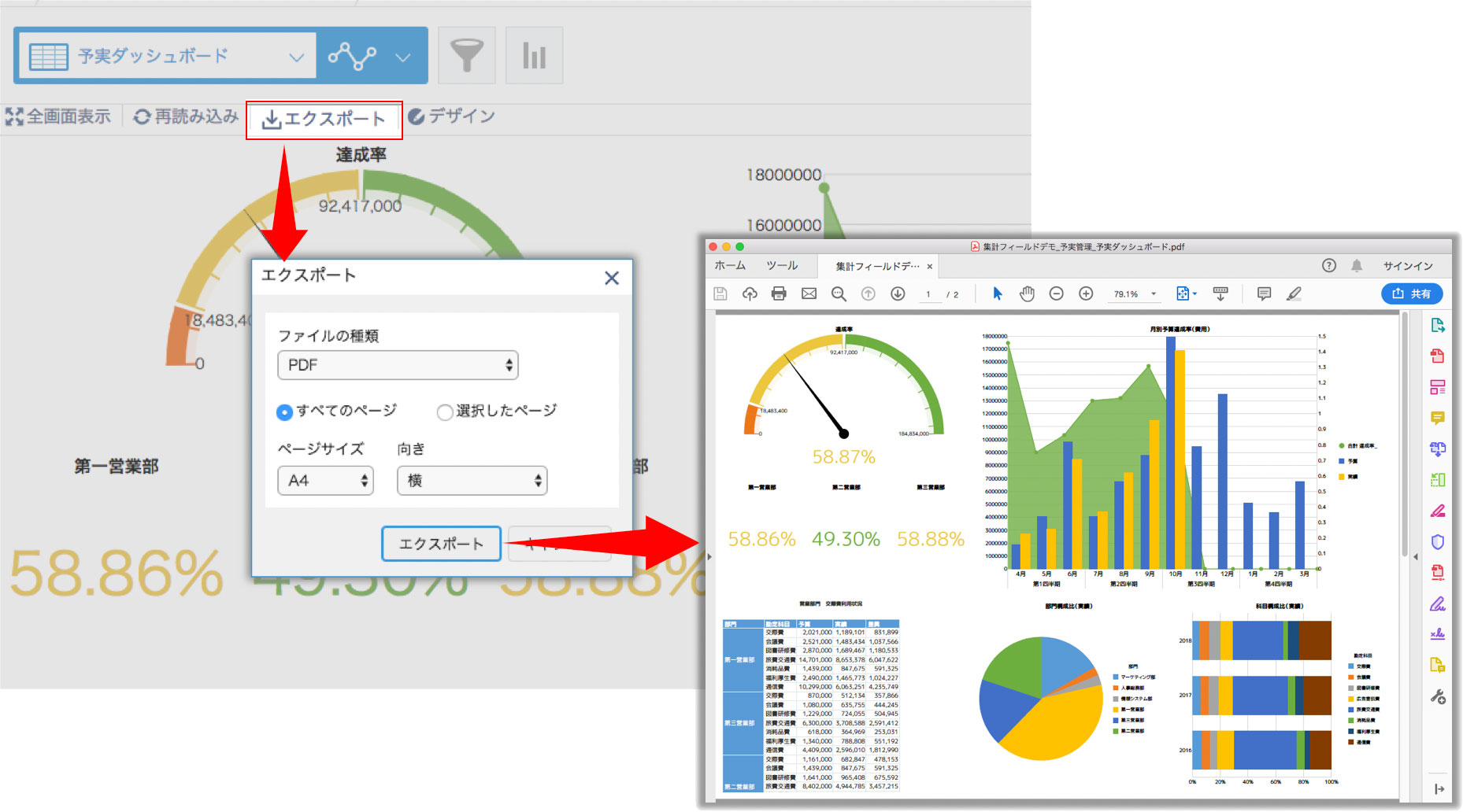 画像やPDF文書に出力、チャートごとのデータをExcelやPDFにエクスポートすることも可能