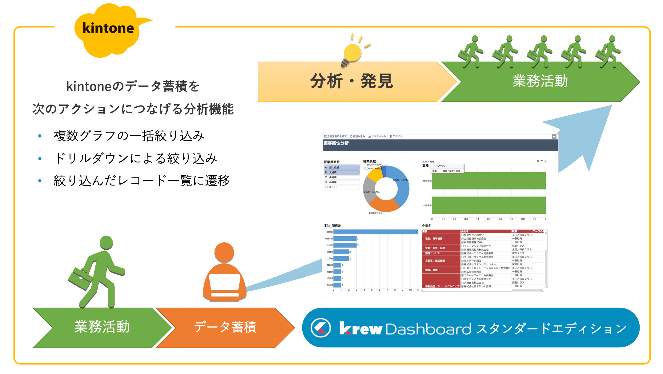 今回のアップデートでは、ダッシュボード上に表示したグラフを直接マウスで操作してドリルダウンしたり、表示する項目をスライサーで切り替えたり、複数のグラフを同時にフィルタリングしたりといった「多角的な分析力」を高める機能を多数搭載した「スタンダードエディション」を新たに提供します。スタンダードエディションでは、経営・業績指標を単なる視覚化やレポート化するだけにとどまらず、kintoneのデータを分析したい人が分析したい角度でいつでも自由に指標を把握することが可能です。