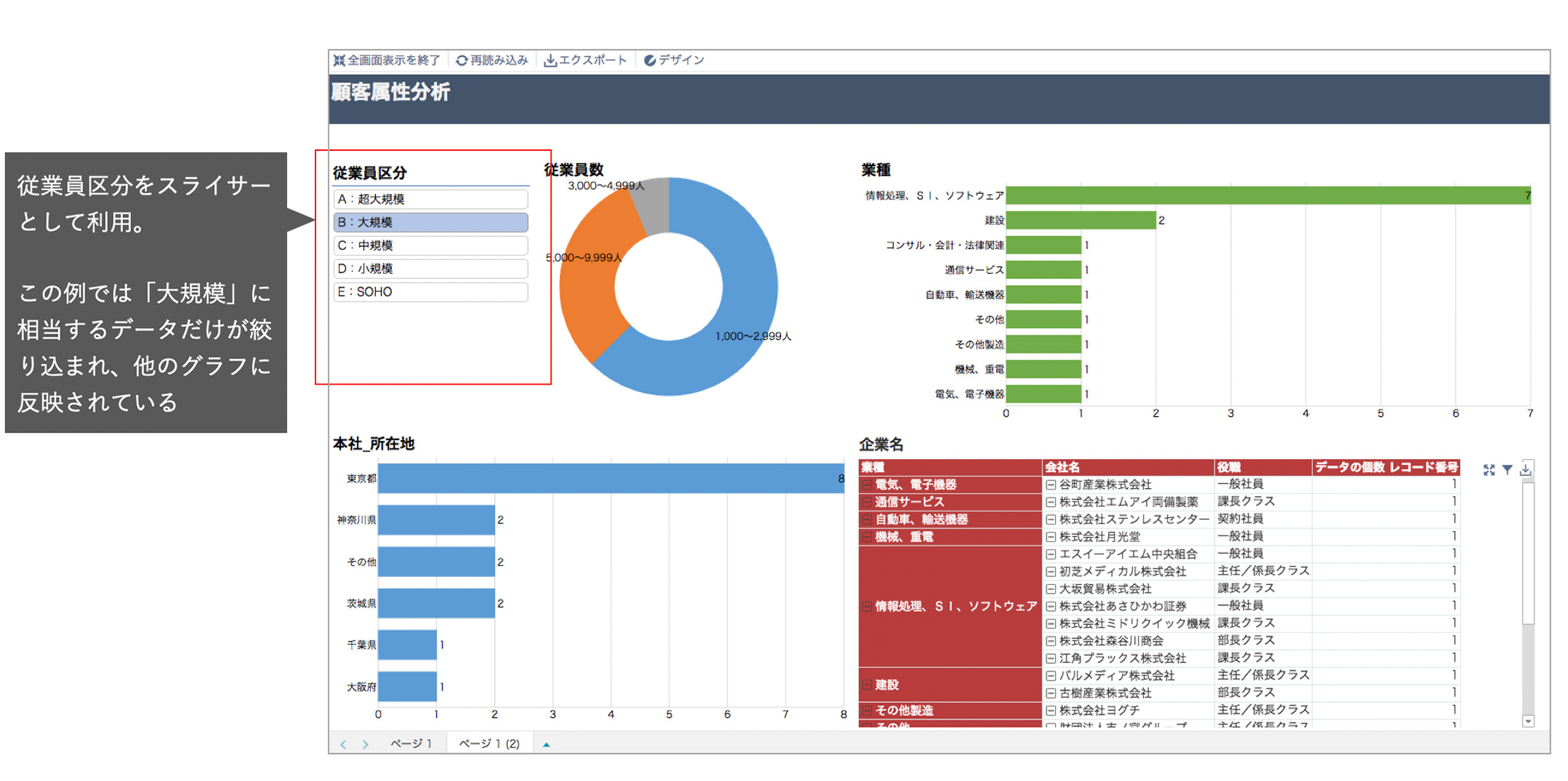 ダッシュボード上で自由にデータをフィルタできるスライサー