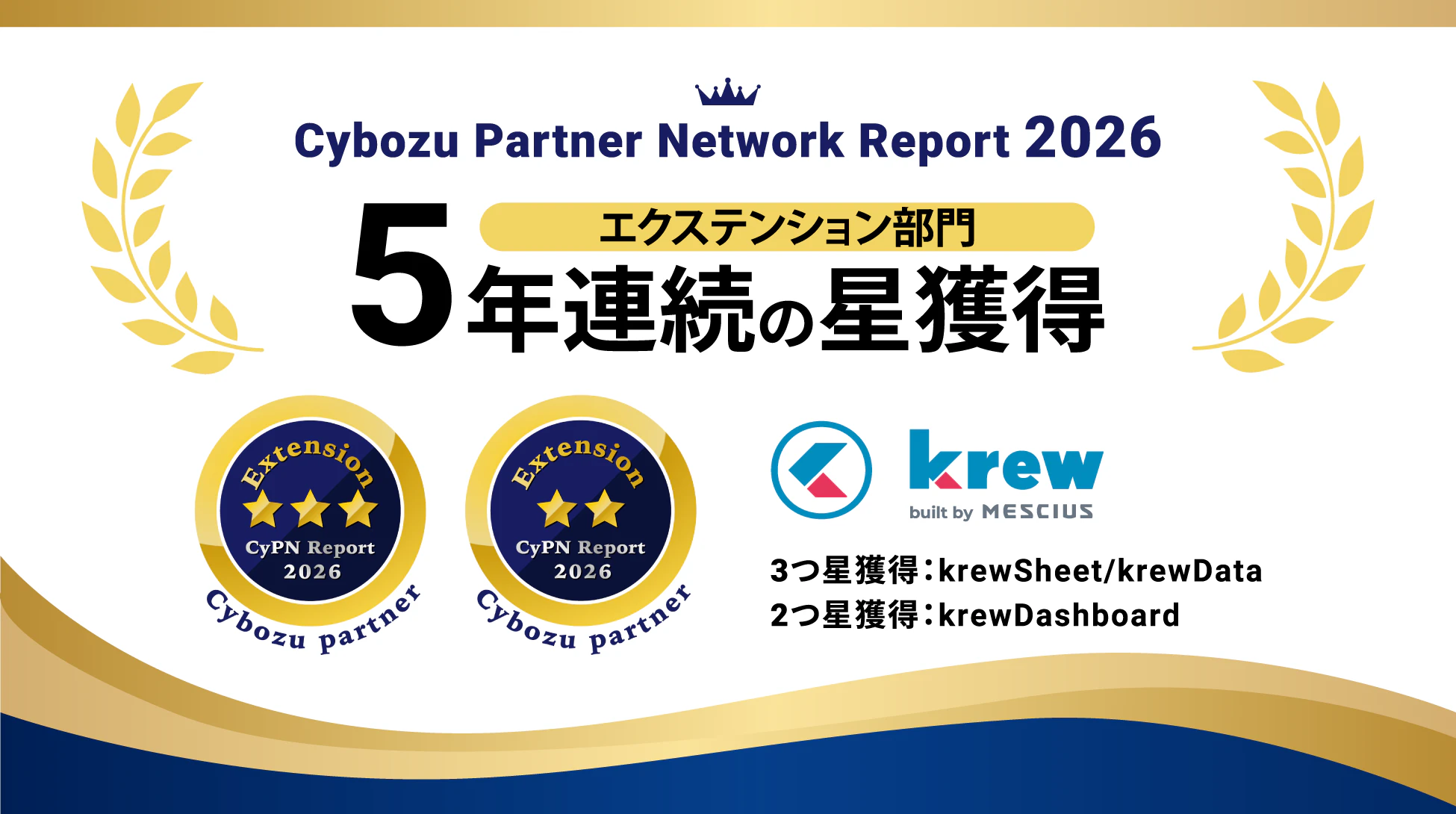 メシウス株式会社(本社:宮城県仙台市泉区、代表取締役社長:小野 耕宏)が提供する、サイボウズ株式会社の業務改善プラットフォーム「kintone」向けプラグイン「krew」シリーズは、サイボウズ株式会社が実施するオフィシャルパートナー評価制度「CyPN Report 2026」エクステンション部門において、下記の通り星評価を獲得しました。