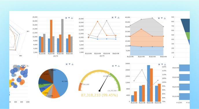 棒グラフ、円グラフ、折れ線グラフなど、データの性質に応じて最適なグラフで表示。直感的に理解しやすい形でデータを提供。
