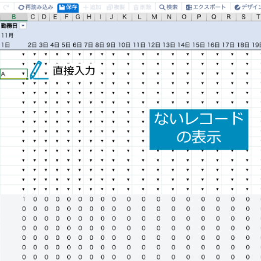 当該のレコードが登録されていない場合も予め入力欄を一覧に表示できます。