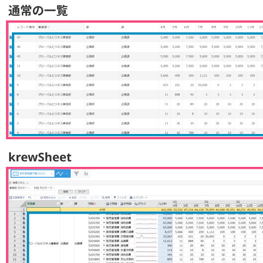 集計しながらデータを入力できるピボットテーブル表示が可能なkrewSheet(Xrossモード)とkrewDashboard(ピボットテーブル)機能の比較表を記載してます。