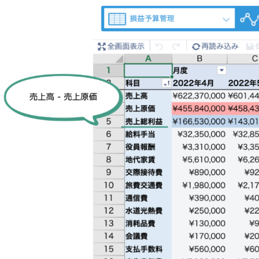 300種類以上のExcel関数と演算子を利用でき、一覧データ上の値を利用して複雑な演算を実現できます。
