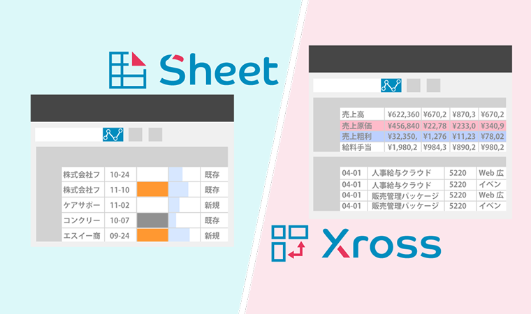 アプリのデータを一覧表示する「Sheetモード」と集計しながらデータを入力できるピボットテーブル表示が可能な「Xrossモード」。用途にあわせてレイアウトを切り替え・選択できます。