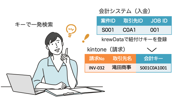 krewData側で紐付けるキーを作成してkintoneに登録しておくことで、会計システム側の入金とそれに対応するkintone側の請求データを紐づけて管理できます。