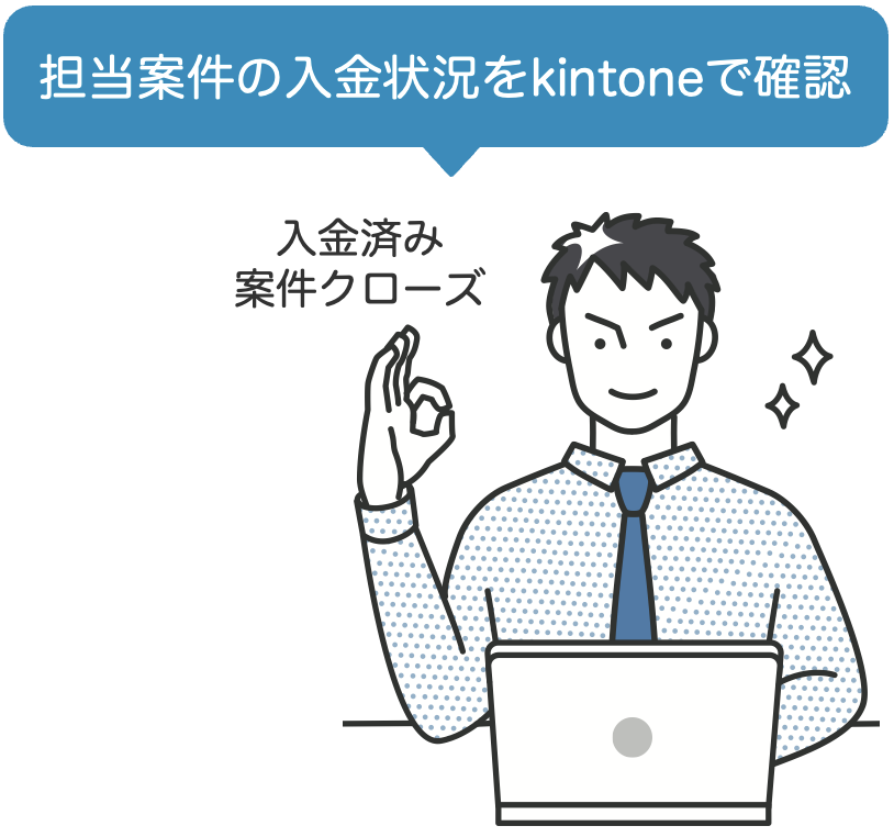 会計システムから入金状況をkintoneに連携し、案件のクロージングや入金の消し込み処理を自動化できます。会計システムや経理担当者へ入金状況を確認する必要はなく、手作業で入金を転記する必要もありません。