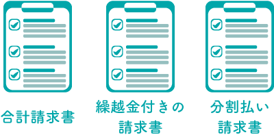 合計請求書や繰越金付きの請求書、分割払い請求書など幅広い請求書のタイプに対応したデータ作成が可能です。残金の管理や支払回数の管理など、複雑な請求管理で起こりやすい煩雑な業務を改善します。