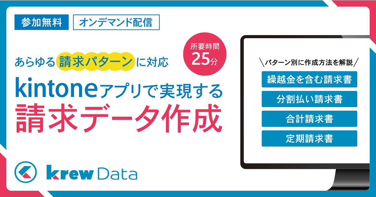 受注情報や商品情報、顧客情報など、請求の元となるデータがkintoneに入力されていれば、毎月の請求書に必要なデータをkrewDataが収集して請求データを作成します。