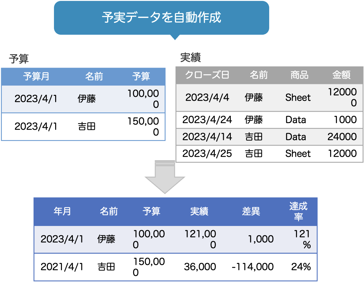 予算と実績データを突き合わせて、差異や達成率など、予実に必要な数字を集計します。個人毎、部門毎、全社毎など見たい単位での集計が専門知識なしで集計できます。