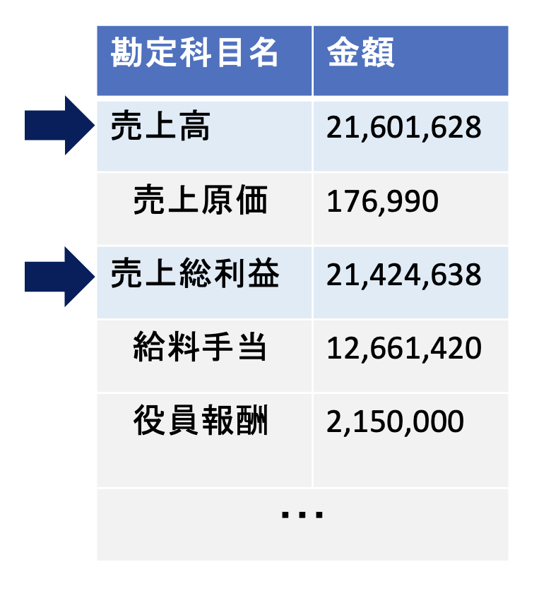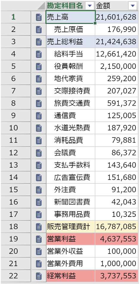 勘定科目同士をさらに演算して計算する「営業利益」や「経常利益」のような数字も集計可能です。