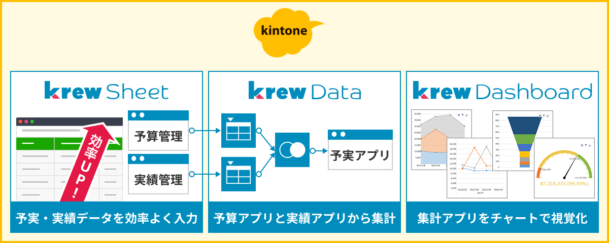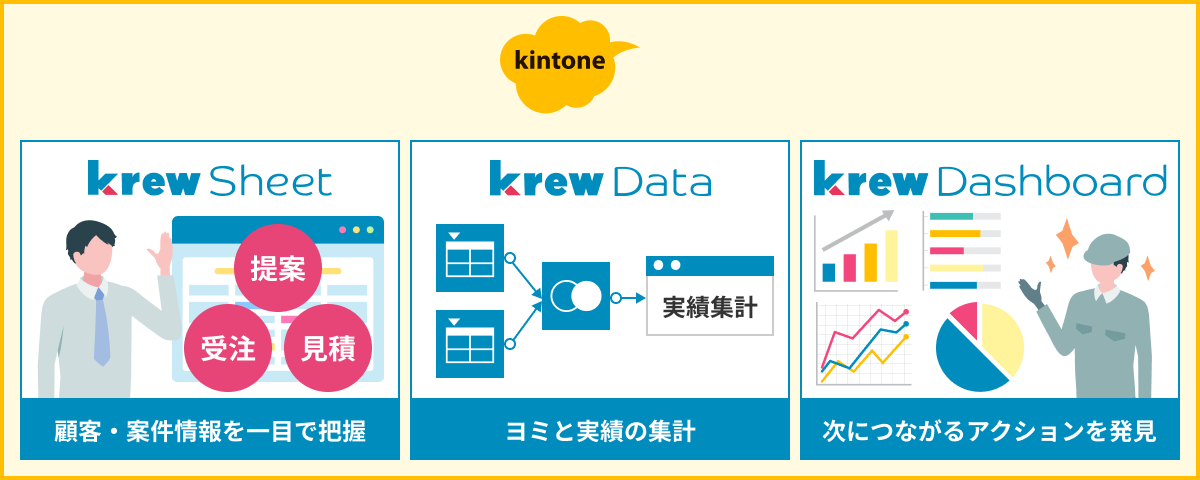 krewシリーズには、kintoneをエクセルライクに操作可能にするkrewSheet、データ集計・加工ができるkrewData、リアルタイムに可視化できるkrewDashboardの3つのサービスがあります。 1サービスでも組み合わせての導入も可能。解決したい内容に応じてサービスを導入いただけます。